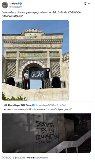 10. İslamcı terör örgütü İBDA-C uzantılı bir hesap sosyal medyada “öyle sadece duvara yazmayız, Üniversitemizin önünde koskoca sancak açarız!” ifadeleriyle İstanbul Üniversitesi önnüde açtıkları tevhid bayraklı fotoğrafı paylaştı. (5 Şubat)