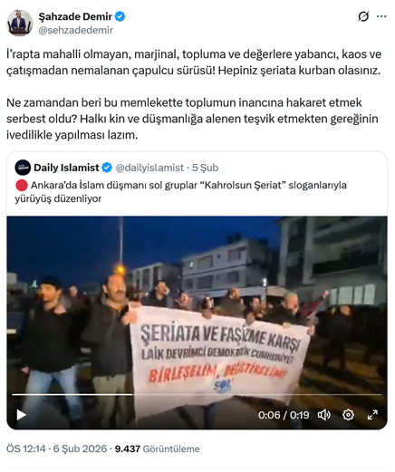 12. AKP listelerinden meclise giren HÜDA PAR Gaziantep milletvekili Şahzada Demir, sosyal medya hesabından yaptığı paylaşımda “Şeriata ve faşizme karşı laik devrimci demokratik cumhuriyet” pankartıyla yürüyüş yapan yurttaşları hedef aldı. Demir paylaşımında “İ’rapta mahalli olmayan, marjinal, topluma ve değerlere yabancı, kaos ve çatışmadan nemalanan çapulcu sürüsü! Hepiniz şeriata kurban olasınız. Ne zamandan beri bu memlekette toplumun inancına hakaret etmek serbest oldu? Halkı kin ve düşmanlığa alenen teşvik etmekten gereğinin ivedilikle yapılması lazım.” ifadelerini kullandı. (6 Şubat)