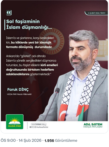 15. AKP listelerinden meclise giren HÜDA PAR Mersin milletvekili Faruk Dinç, TBMM yaptığı açıklamada “Dünyada sol akımlar, savundukları evrensel ilkeleri dillendirirken, Türkiye’de bir takım sol görünümlü fraksiyonlar ise hem teorik hem de pratik olarak küresel sol damardan ayrışmakta, faşizan duygulara devrimci kılıflar uydurarak yol almaya çalışmaktadır. Özellikle islama ve şiarlarına, müslüman halkın inancına ve kutsal değerlerine karşı besledikleri kin, bu kliklerde yeni bir ideolojik formata dönüşmüş durumdadır. En son Ankara’da görüldüğü üzere gösteri adı altınsa islama yönelik sergiledikleri düşmanca tutumları, bu faşist kliklerin kirli emelleri doğrultusunda birtakım hedeflere odaklandıklarını göstermektedir. Tek parti tipi demokrasi özgürlük arzuları, camileri ahıra çevirmeyi amaçlayan laikçi duyguları, İstanbul Sözleşmesi çığırtkanlıklarıyla beslendikleri ecnebi fonları, cinsiyet eşitliği fedailiğine soyunarak toplumda yeni Epstein adacıkları oluşturma hevesleri, islami şiara karşı besledikleri kin ve adavette onların başlıca motivasyon kaynakları olmuştur. Bazı belediyelerin ihale çöplüklerinden aşırdıkları kirli lokmalarla böğüren bu tür provokatör klikler bir tür sosyal karantinaya alınmalıdır.” dedi. (14 Şubat)