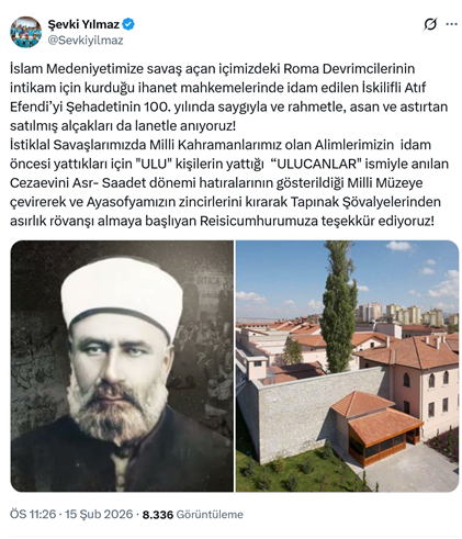 17. Refah Partisinden 20. Dönem milletvekilliği yapan Cumhuriyet, laiklik ve Atatürk düşmanı Şevki Yılmaz, sosyal medya hesabından yaptığı paylaşımda, Kurtuluş Savaşı karşıtı ve Cumhuriyet düşmanı İskilipli Atıf’ı andı. Yılmaz paylaşımında “İslam Medeniyetimize savaş açan içimizdeki Roma Devrimcilerinin intikam için kurduğu ihanet mahkemelerinde idam edilen İskilifli Atıf Efendi’yi Şehadetinin 100. yılında saygıyla ve rahmetle, asan ve astırtan satılmış alçakları da lanetle anıyoruz! İstiklal Savaşlarımızda Milli Kahramanlarımız olan Alimlerimizin idam öncesi yattıkları için "ULU" kişilerin yattığı “ULUCANLAR" ismiyle anılan Cezaevini Asr- Saadet dönemi hatıralarının gösterildiği Milli Müzeye çevirerek ve Ayasofyamızın zincirlerini kırarak Tapınak Şövalyelerinden asırlık rövanşı almaya başlıyan Reisicumhurumuza teşekkür ediyoruz!” ifadelerini kullandı. (15 Şubat)