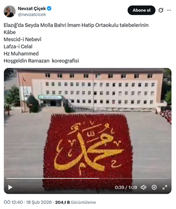 21. Independent Türkçe Genel Yayın Yönetmen Nevzat Çiçek, sosyal medya hesabından “Elazığ’da Seyda Molla Bahri İmam Hatip Ortaokulu talebelerinin Kâbe Mescid-i Nebevî Lafza-i Celal Hz Muhammed Hoşgeldin Ramazan koreografisi” ifadeleriyle video paylaşımı yaptı. (18 Şubat)