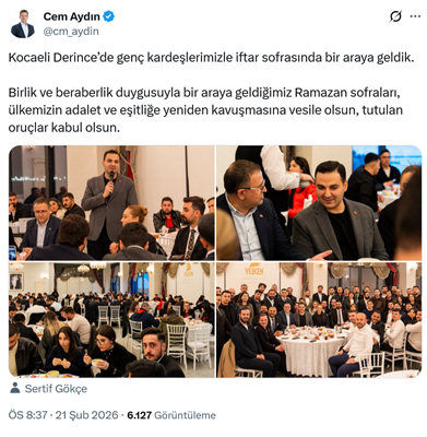 26. CHP Gençlik Kolları Başkanı Cem aydın, sosyal medya hesabından Kocaeli Derince’de katıldığı iftar programını paylaştı. Aydın “Kocaeli Derince’de genç kardeşlerimizle iftar sofrasında bir araya geldik. Birlik ve beraberlik duygusuyla bir araya geldiğimiz Ramazan sofraları, ülkemizin adalet ve eşitliğe yeniden kavuşmasına vesile olsun, tutulan oruçlar kabul olsun.” Sözleriyle programdan fotoğraflar paylaştı. (21 Şubat)