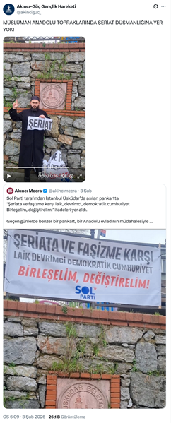 1. İslamcı terör örgütü İslami Büyük Doğu Akıncıları Cephesi (İBDA-C) bağlantılı “Akıncı Güç” isimli sosyal medya hesabından yapılan video paylaşımında, SOL Partinin “Şeriata ve faşizme karşı laik, devrimci, demokratik cumhuriyet. Birleşelim, değiştirelim!” pankartı hedef gösterilerek, “Müslüman Anadolu topraklarında şeriat düşmanlığına yer yok” dendi. Paylaşılan videoda konuşan takkeli cüppeli bir şahıs “Dünya Epstein skandalıyla çalkalanırken içimizdeki islam düşmanları hala şeriata, müslümanların değerlerine hakaret etmekte. Şeriat aleyhine hiçbir pankarta müsade etmeyeceğiz. Şeriat aleyhine atılan her adımın engelcisi olacağımızı buradan ilan ediyoruz.” ifadelerini kullanarak pankartı kaldırdı. (3 Şubat)