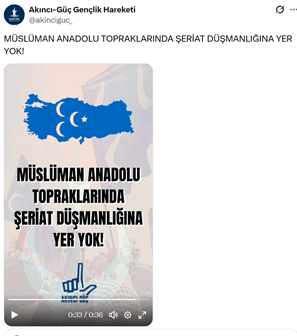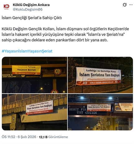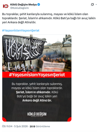 3. İslamcı terör örgütü Hizb-ut Tahrir’in yayın organı Köklü Değişim Medya sosyal medya hesabından yapılan paylaşımda “Bu topraklar, şehit kanlarıyla sulanmış, mayası ve kökü İslam olan topraklardır. Şeriat, İslam'ın ahkamıdır. Kökü Batı'ya bağlı bir avuç laikin yeri Ankara değil Atina'dır. #YaşasınİslamYaşasınŞeriat” ifadeleri yer aldı. (5 Şubat)