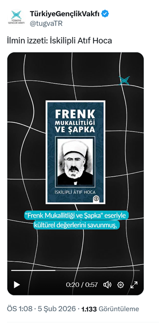 4. AKP’li Cumhurbaşkanı R.T. Erdoğan’ın oğlu Bilal Erdoğan’ın yüksek istişare kurulu başkanı olduğu TÜGVA’nın sosyal medya hesabından Milli Mücadele ve Cumhuriyet düşmanı İskilipli Atıf’ı anan video paylaşımı yapıldı. Videoda, “İskilipli Atıf hoca, ilmiyle öne çıkmış, bulunduğu dönemde halkın gönlüne taht kurmuş bir müderristir. Batı taklitçiliğine karşı 1924 yılında kaleme aldığı ‘Frenk mukallitliği ve şapka’ eseriyle kültürel değerlerini savunmuş, inancının onurunu müdafaa etmiştir. Henüz şapka kanunu ortada yokken öncesinde yazdığı fikirleri sebebiyle İstiklal Mahkemelerinin karanlık dehlizlerinde idama mahkum edilmiş; ancak davasından asla taviz vermemiştir. Fikirleri nedeniyle yargılandığı süreçte şehadete yürüyerek tarihe derin bir iz bırakmıştır. Halkın ona olan sevgisi sadece ilminden değil, mazlumun yanında sergilediği sarsılmaz tavrından gelmektedir. Atıf hocanın bu aziz duruşu, ilme ve değerlerine sahip çıkan gençlere her daim ilham verecek sarsılmaz bir irade mirası olmuştur. (5 Şubat)